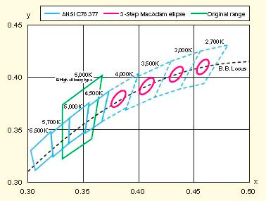 “ 三步迈克亚当椭圆”色度范围 ANSI C78.377 是由美国国家标准协会制定的色度范围标准。实诺锐照明产品色度范围不但符合ANSIC78.377 ,部分产品甚至符合更严格的“ 三步迈克亚当椭圆”色度范围缩小至有关上述标准的九份之一。 |